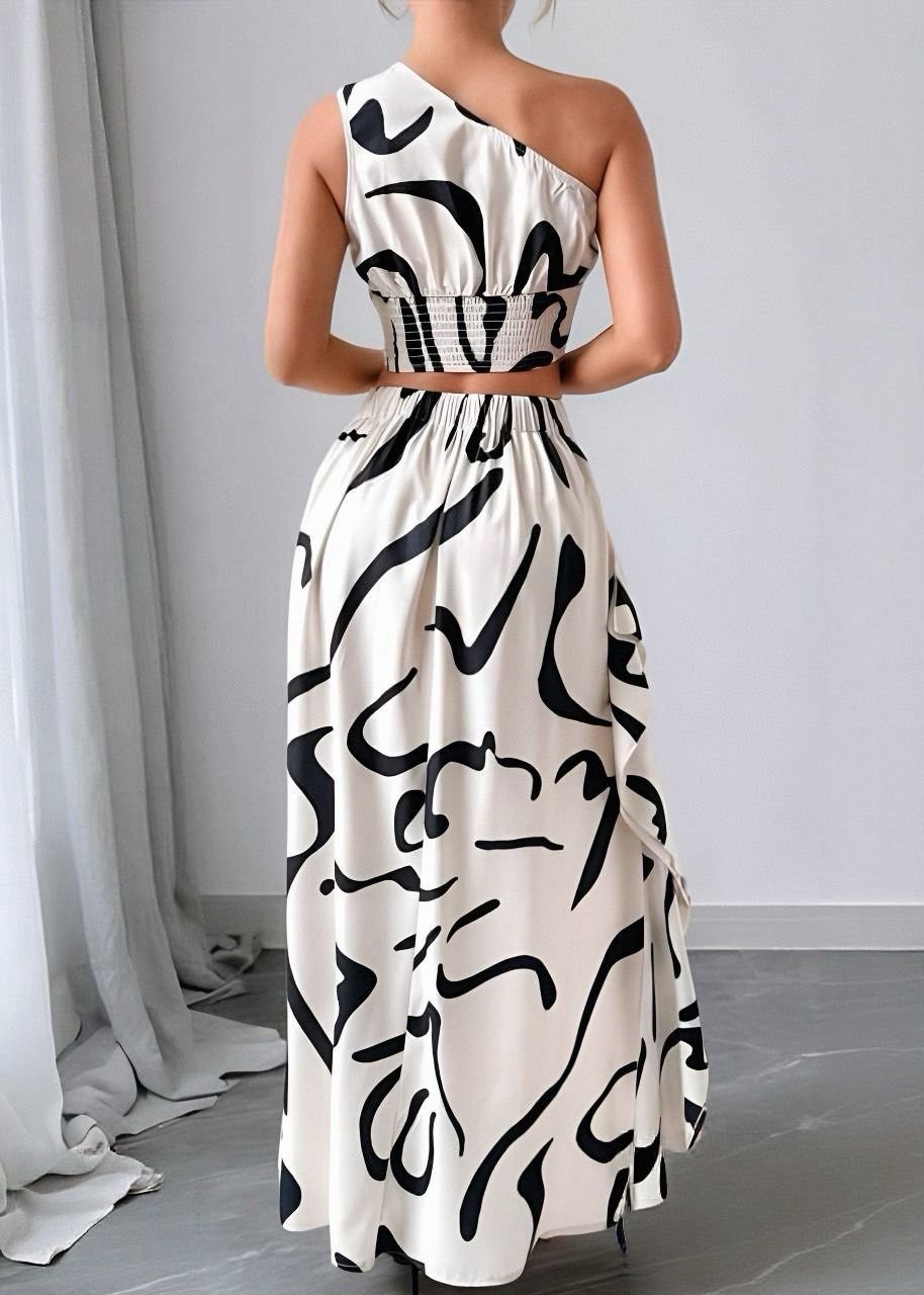 Abstract Print One-Shoulder Maxi Set