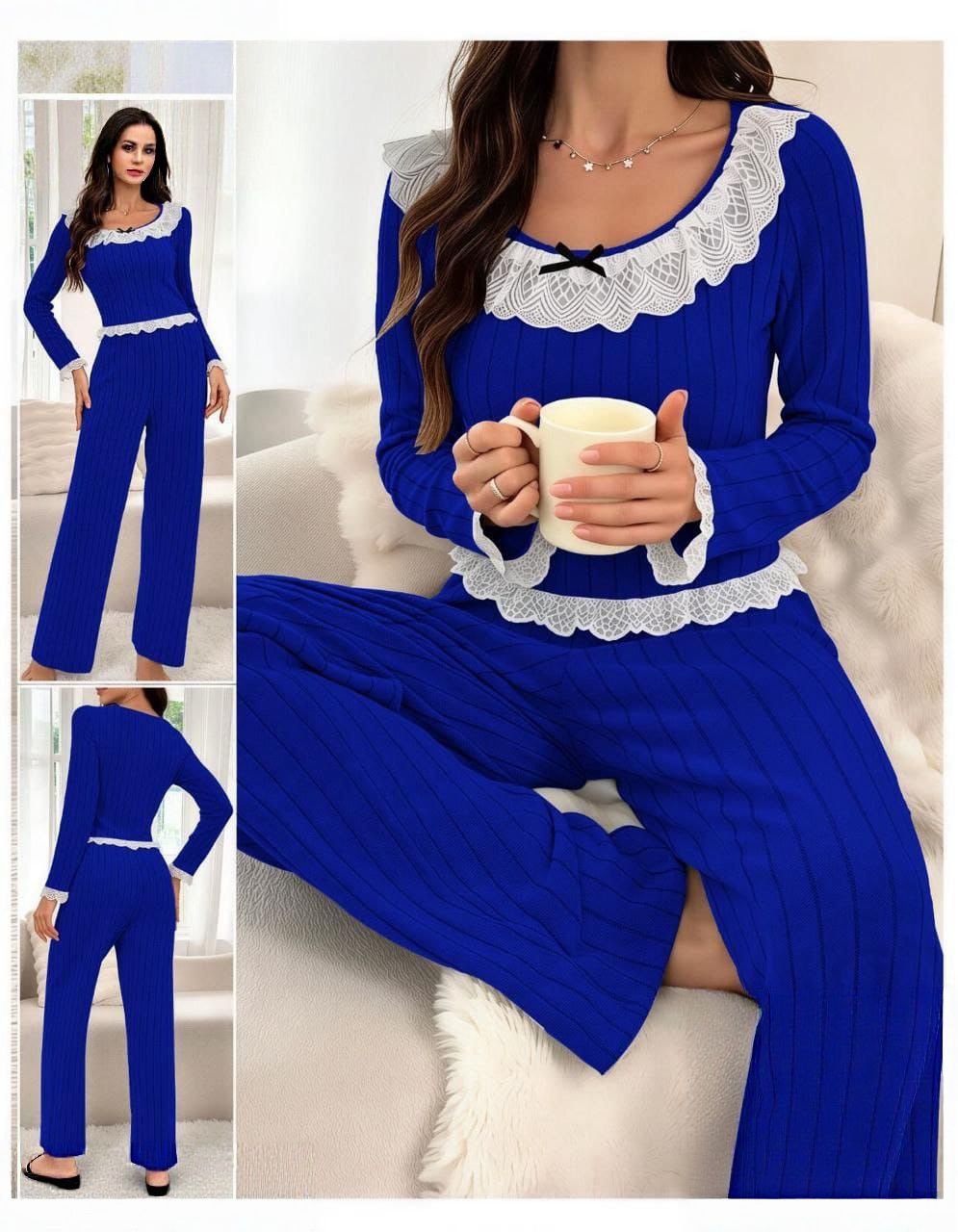 Elegant Rib-Knit Pajama Set with Lace Trim