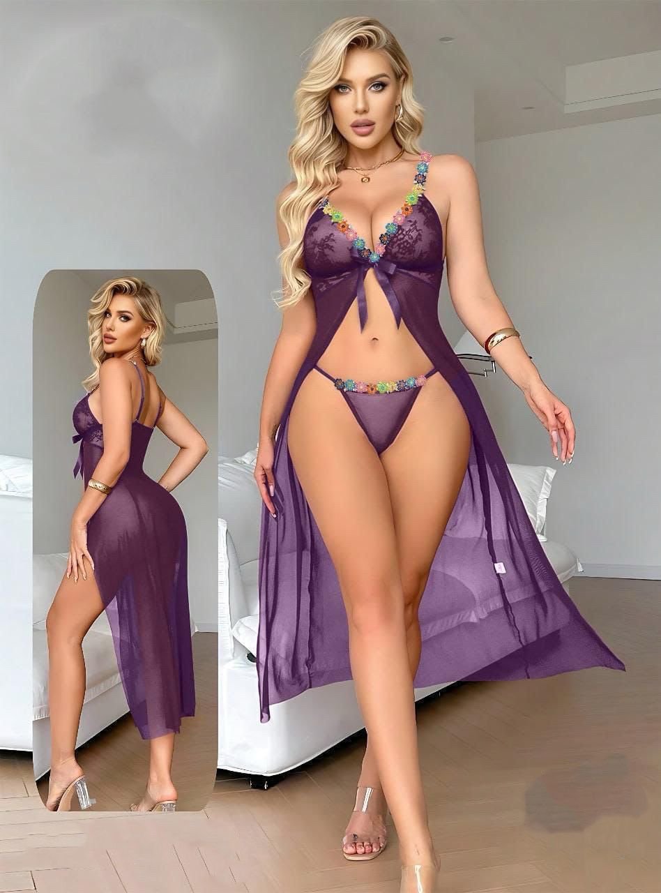 Elegant 2-Piece Floral Applique Mesh Babydoll Set