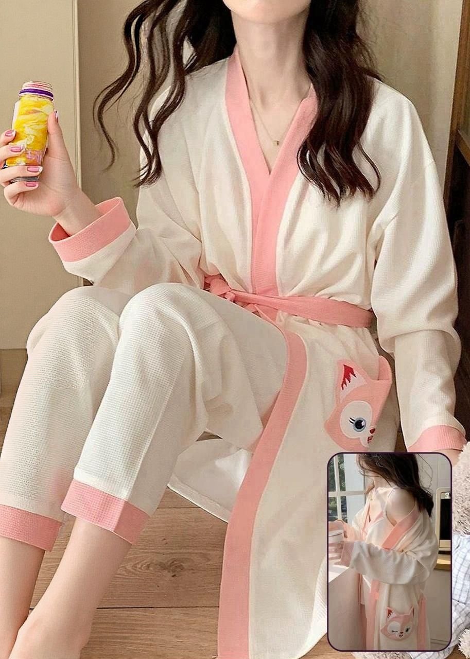 Elegant 3-Piece Waffle Knit Loungewear Set – Kimono Robe & Pajamas.