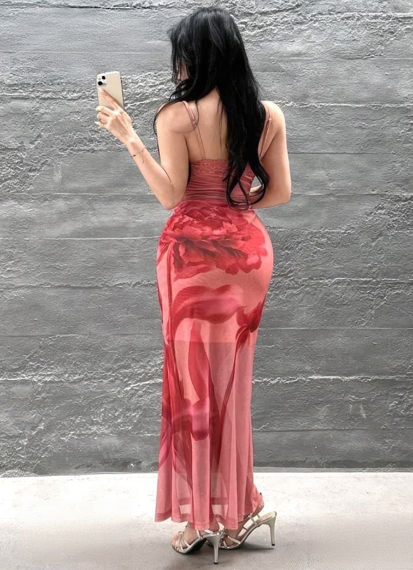 Elegant Floral Mesh Maxi Dress – Rose Pink