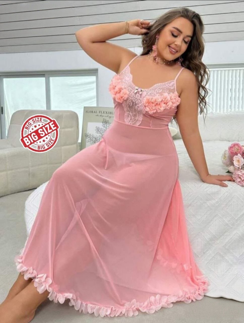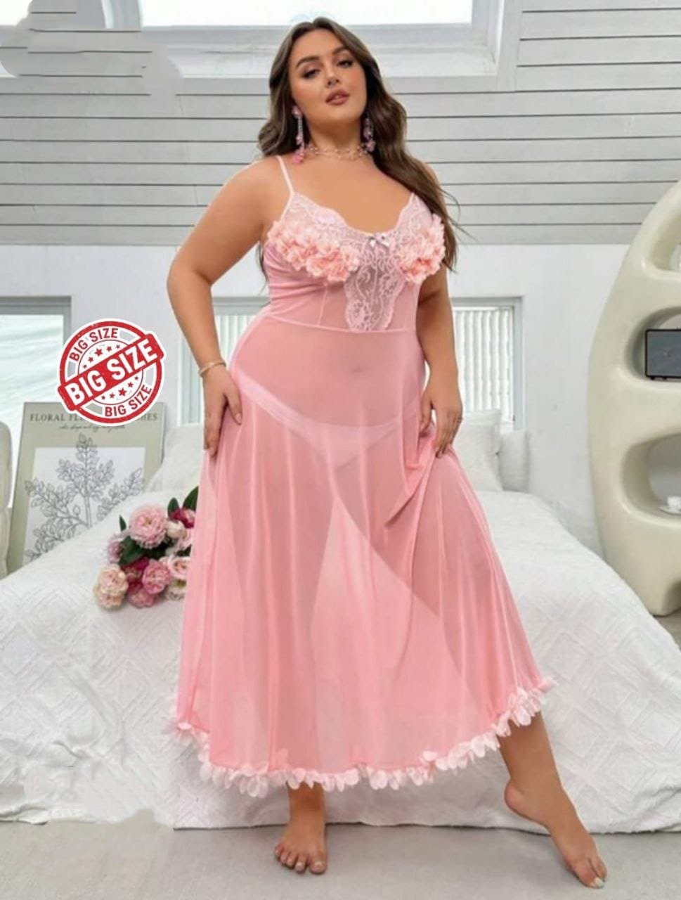 Elegant Floral Mesh Nightgown – Plus Size