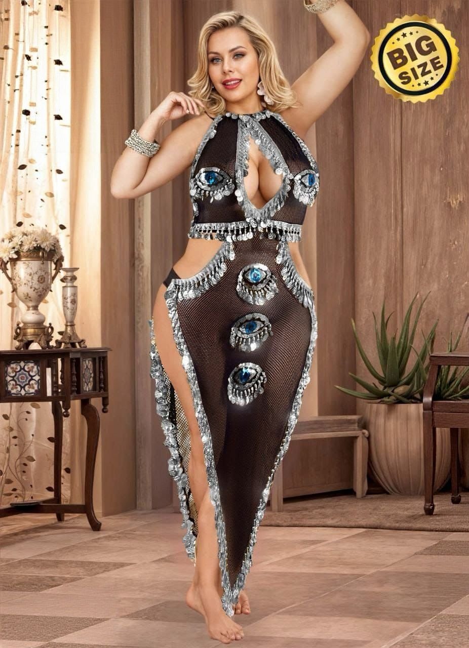 Exotic Evil Eye Mesh Performance Costume – Sequin & Coin Embellished Halter Gown