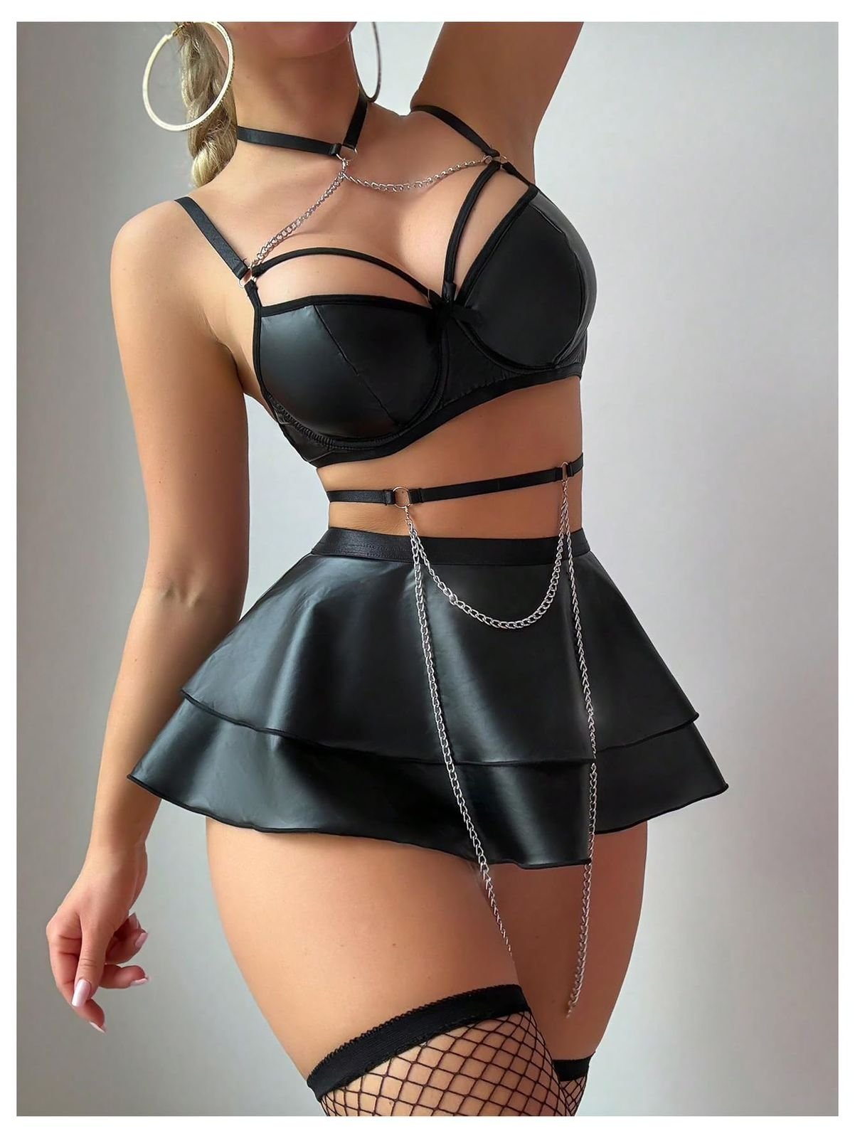 Faux Leather Bra & Skater Skirt Lingerie Set with Harness Detail
