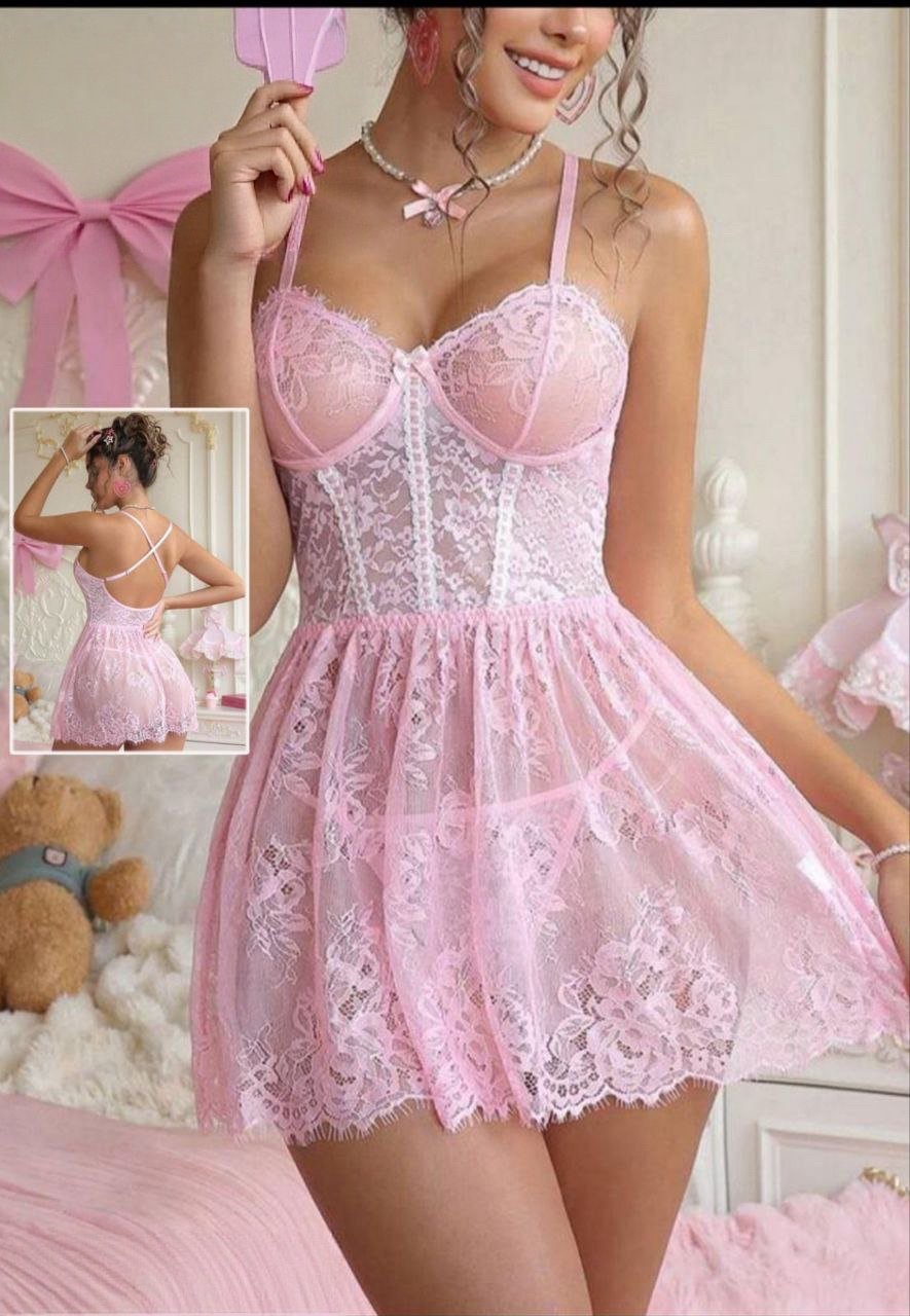 Pink Floral Lace Babydoll Set