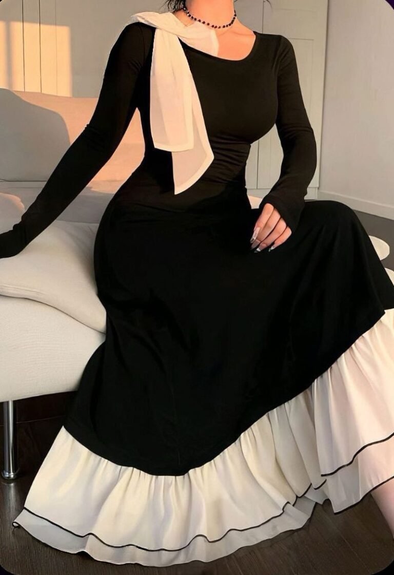 Elegant Black Long-Sleeve Maxi Dress with Bow and Ruffled Hem
